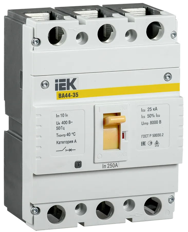 Автоматические выключатели ВА44 IEK предназначены для проведения тока в нормальном режиме и отключения тока при коротких замыканиях, перегрузке, недопустимых снижениях напряжения, а также для оперативных включений и отключений участков электрических цепей.